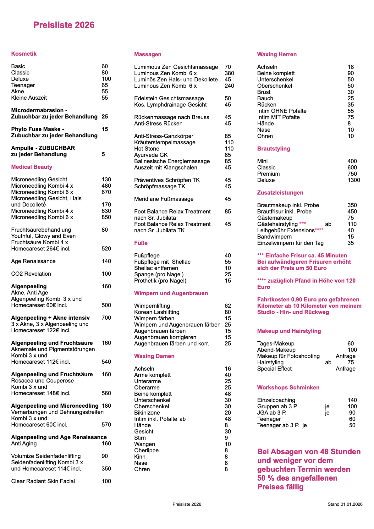 Sollten Sie einen Termin nicht wahrnehmen können, ist eine rechtzeitige Absage von mindestens 48 Stunden im Voraus erforderlich. Bei kurzfristigeren Absagen oder Nichterscheinen wird eine Ausfallgebühr in Höhe von 50 % des gebuchten Behandlungpreises fällig.
